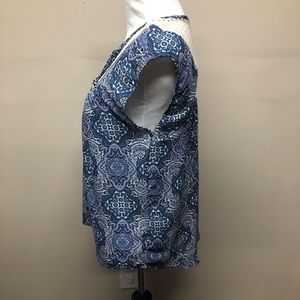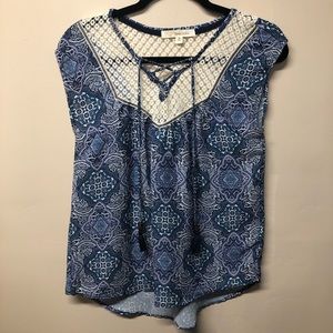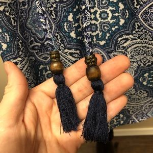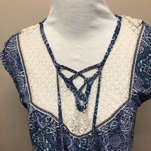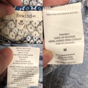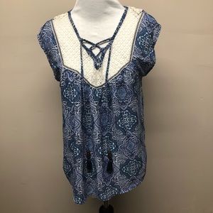 Rewind. Boho blouse with a crochet neckline & back. Tie detail around the neck with tassels. Slight high low hem. Size Medium.