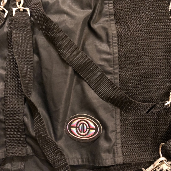 I bought this at Camden Market in London in 2001. By cyber goth brand Arena. Made in the UK. Four bondage straps in the front, zips up the back. Mesh details throughout. Really unique piece.