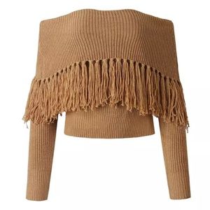 Camel off the shoulder long sleeve sweater with fringe. Cropped fit.