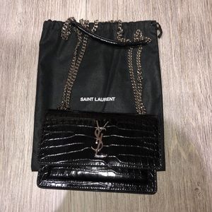 Yves Saint Laurent Sunset Chain Wallet in black crocodile shiny leather. Brand new, never used. Comes with dustbag, box, and all cards. Purchased off of Farfetch in 2017, shipped straight from Italy. Can provide proof of the purchase on request. I absolutely love this, but I never get any use out of it. No flaws on the leather. Minor scratching on the YSL logo but only visible under flashlight/close up flash photography.