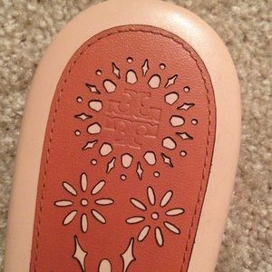 Tory Burch "Miller" thong sandal with an elaborately scalloped logo detail. Leather upper in a light blush pink (called 'sea shell'). Flat heel. Slide style. Laser-cut footbed. Leather lining. Triacetate sole. Brand new, authentic and flawless! Box/dust bag not included.