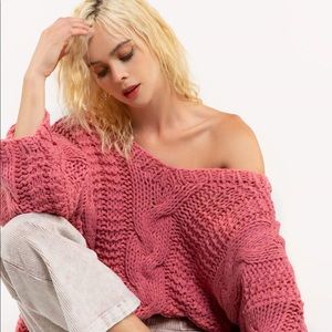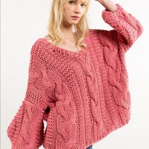 POL, Bubble Gum Pink Hand-made Chunky slouchy cable knit sweater with dropped shoulder and balloon sleeves. This will not disappoint.