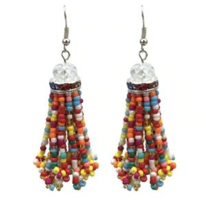 New in packet. Just in, will sell fast. You will not be disappointed with these beauties. Hand Made multicolored Beaded Tassel dangle Earrings. Light weight. For dimensions please see photos. Fish hook closures. Metal type: Zinc alloy. Imported NWOT.
