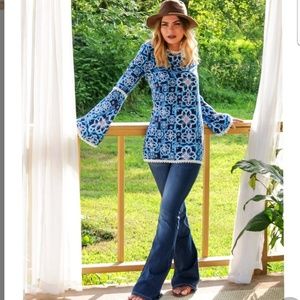 Pretty long sleeve tunic is navy and sky blue with small orange accents. Has a floral pattern with lace trim at collar, elbows, cuffs and bottom. Great for fall with blue jeans or leggings. 100% cotton.