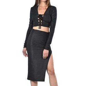A Beautiful Black Textured lace up top and high Split midi Skirt Two Piece Set Features Top: Long sleeves, plunging "V" neckline, front lace up closure, textured, cropped length, padded shoulders