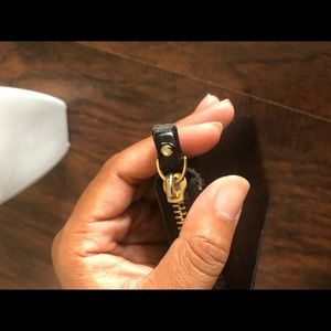Super cute and classic black leather bow tie wallet! Signature pattern and a beautiful cream colored interior, with plenty of card slots and pockets. 8.5” w, 4” h, 1” d. In nearly perfect condition! PLEASE NOTE: the exterior zipper pull has been damaged (see last picture). It is a cosmetic flaw only, and does NOT affect the zipper function itself.