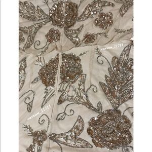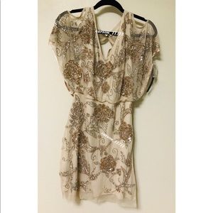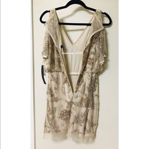 Swathed in silver and gold beads, this champagne mini features exaggerated flutter sleeves with cold-shoulder details. A deep-v neckline and cutout back complete the look.