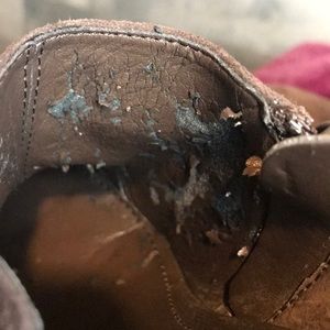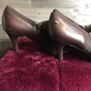 These pretties have some wear. Refer to photos, but still super cute and well made. Gorgeous chocolate brown color. Cute zipper detail on side and the gold Calvin Klein hardwear emblem on the side. Look classy and sassy in these heels