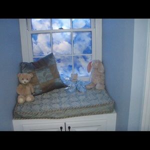 Baby crib patchwork Toile blanket and crib skirt and 3 window valances