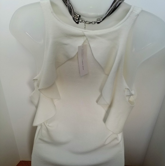 Cold shoulder blouse white knit top. Ribbed around bottom for comfortable fit. Flutter sleeves that drape down the sides of the front and back. Never worn. Still with tags. Small mark on the flutter sleeve. Looks like it can be removed, but I didn't try. Soft knit material against the skin.
