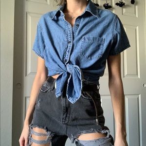 The Missy buttondown! Super cute denim short sleeve collared top! Soft denim so you can tie it, tuck it in, or wear it as is for a variety of looks! Perfect condition! Tagged a M modeled on XS! NO TRADES sold on depop
