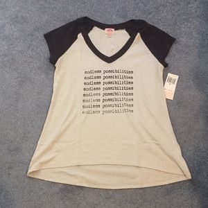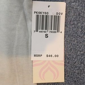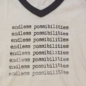 Pl movement by Pink Lotus that was sold by athleta. This shirt has endless possibilities literally wrote all over it! Lol Super cute v neck top that is flowy at the bottom. Would match so many different leggings. This could be used to workout in or just for comfort with jeans or leggings. The print starts really dark then fades out.