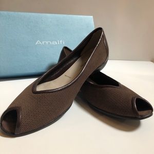 Amalfi Sallena peep toe flats in brown suede nubuck. These are a size 10M and have only been used once in the house, not outdoors. They are a cute and easy to wear addition to any shoe collection.
