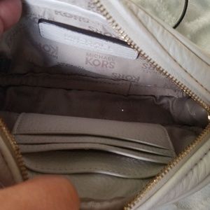 Michael Kors Hamilton white small crossbody purse with gold hardware. Perfect for on the go situations. One open pocket in the inside of the purse and also a 4 slot credit card holder. In good condition there is a red mark inside of purse and also a small little spot in the front. See pictures for detail.