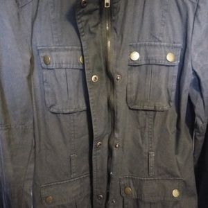 Cotton ,Green, this jacket is thin ,has zipper and buttons 2 small pockets at the top and 2 larger pocket at the bottom with flaps military looking jacket