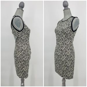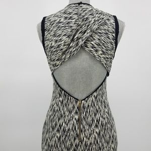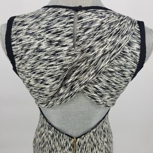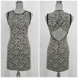 Black and white space dye printed cotton Sandro Reve dress with black silk trim and open back with unique cross-over detail & exposed zip closure. Form fitting sheath dress.