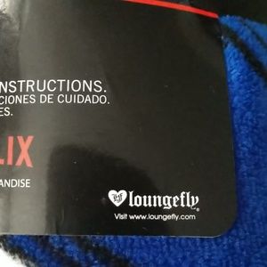 Up for purchase is a brand new/ NWT Loungefly Netflix Stranger Things Fleece throw. The throw is a rare find. It has Eleven, Mike, Dustin and Lucas playing Demogorgon (Dungeon and Dragons). The throw does have the cardboard image that shows you what the throw looks like opened. I have included an image of what the blanket looks like. The blanket is 48 x 60 inches.