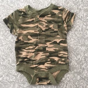 Baby GAP Camouflage shortsleeved onsie bodysuit with patch pocket and henley style button collar. Size 0-3 months. Excellent condition!
