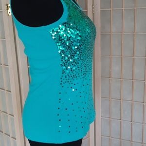 Green sequined women's size s ribbed tank top. Scoop neck. Pair with mermaid leggings (sold separately) 23" long. 16" across laying flat from pit to pit. Bundle and save. mermaid shiny bling pixey