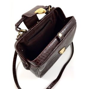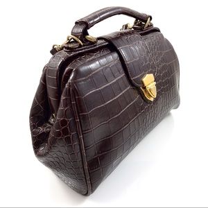 1980’s brown crocodile embossed faux leather doctor style satchel. Beautiful vintage condition. Vegan friendly faux leather embossed to look like crocodile skin. Bag has a gold style lock on front, hinged wide mouth opening. Inside is clean brown fabric with 2 zipper pockets and an additional compartment. Gold metal feet on bottoms. Detachable strap. Can be worn top handle, cross body or on shoulders. Measures 9.5” across the top, 11” across the bottom, 8” tall, 4” deep. Strap drop measures 22”