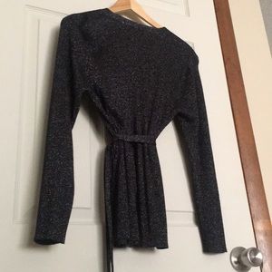 Black cardigan with silver glittery sparkles throughout. Tie belting.