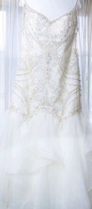 Beautiful mermaid fit gown with sparkling crystal beading detail. Sample dress. No stains, no tears, excellent condition. Professionally cleaned. Alterations include bustle and bra pads added for support to be worn without bra. Both can easily be removed if not needed or wanted. Free shipping and authentication by Poshmark. Make me an offer. Willing to negotiate. Will consider all reasonable offers. Dress is in excellent condition and clean. Veil/Cape available in separate listing.