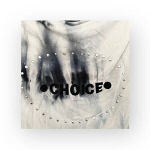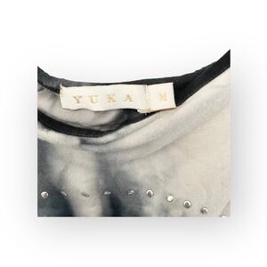 Stunning black tie dye and silver studs highlight a perfectly cut cold shoulder top rendered in stretch viscose. Cap sleeves can be worn on or off shoulder. Velvet lettering adds to the mystique. Swoon 𖦹