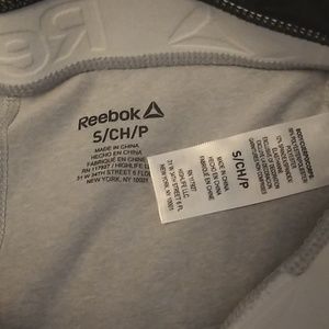 Grey cropped athletic pants by Reebok. Black and white waistband has Reebok in the white in raised letters. Spandex material. No pulls or runs. Excellent condition!