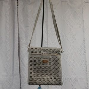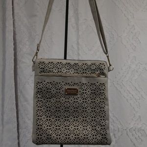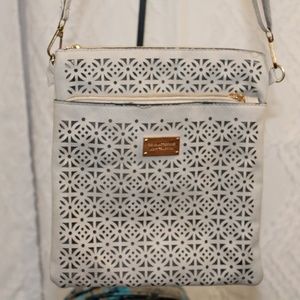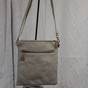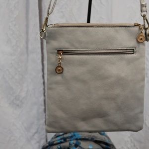 Fashion Accessories faux leather crossbody bag bone color with cutouts. Adjustable strap. Zip pouch on front and back. Gold tone hardware. Good condition flaw is hardware is losing varnish. 9inch x 10 inch