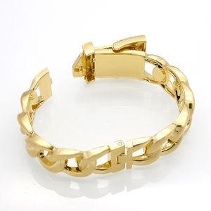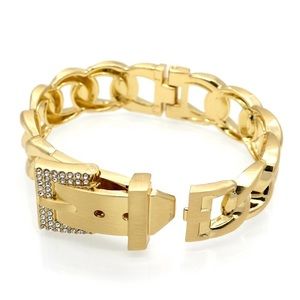 Stylish gold bracelet with belt buckle closure. Large chain link style. Rhinestone embellished. Dress it up or dress it down.