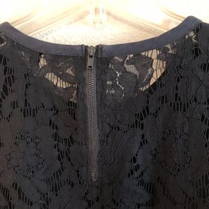 Black floral patterned lace top. The front has an opaque black lining and the back in unlined peek-a-boo lace with an exposed partial zipper.