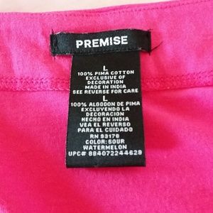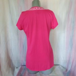 Premise - hot pink, short sleeved tunic top with white embroidery and sequins around the neckline.
