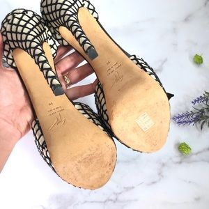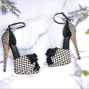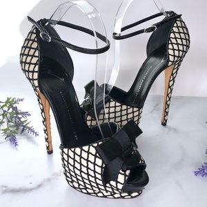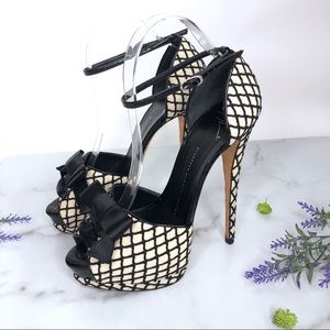 Giuseppe Zanotti Alicia Black & White Fishnet Peep Toe Platform Heels with Bow, Size 39
