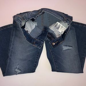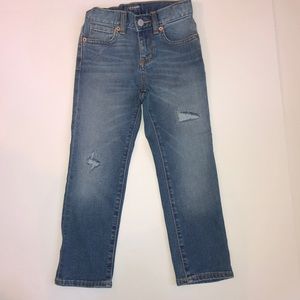 Various Boys Pants size 5. 5 total- blue pants with cuff, blue fleece sweats, blue joggers with white stripes and two pairs of jeans (one with intentional distress and never worn). All pants that aren’t sweats have elastic/button sizer inside. Will arrive freshly washed.