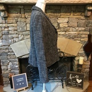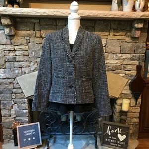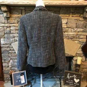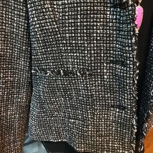 This is a beautiful fringe trimmed blazer, new with tags. This is a black and white material that will go perfectly with any color. This is a cropped jacket which makes it a very flattering fit. Button closure. The fringe detailing gives this jacket a feminine touch. Comes from smoke free home.