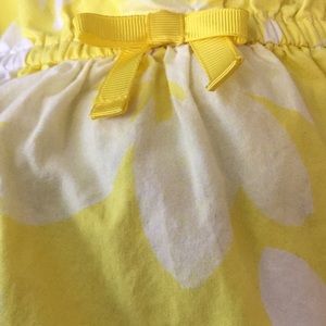 Adorable sunny yellow and white sundress. No rips. A very slight grey discoloration on front of dress but only barely noticeable if looking really close - cannot see well ( see photo ). Two front pockets. 100% cotton material. Size is 4T