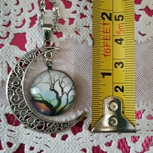 Beautiful filigree crescent moon with glass tree bead. 16" silvertone chain with 2" extender.