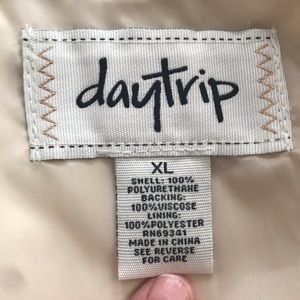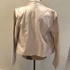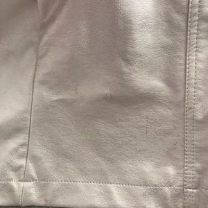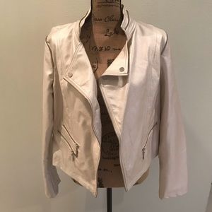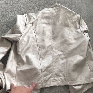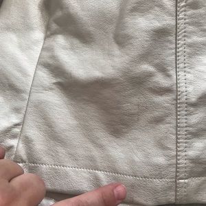 Daytrip faux leather jacket. Cream with silver hardware. Worn once. Small discolored spots. Hard to see. My finger is pointing to them. On the left back of jacket. The jacket doesn’t zip up. The zipper is decorative.
