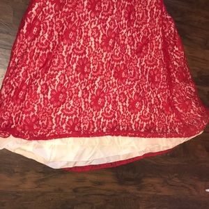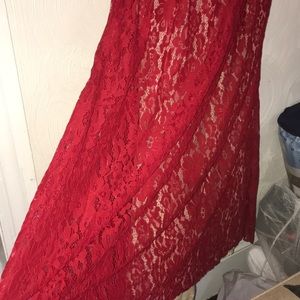 It is a red red lace dress WORN ONCE! It is plus sized. It fits nice!