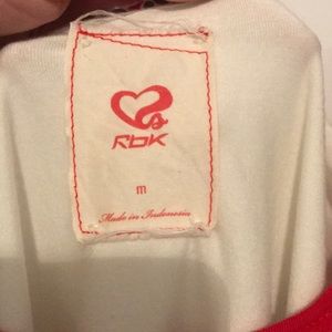 RBK Reebok red and white striped athletic top could be worn during exercise or as athleisure wear. Cute heart emblem and piping detail along sleeves. Nice soft shirt texture. Size medium.