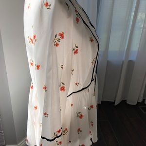 LC Lauren Conrad Bohemian Floral Blouse w/ tassels is a size medium, it is a peasant style, blouse with gorgeous, long bell sleeves. The black, velvet-like ribbon trim has tassel ties that are sexy yet understated. The blouse also has a ruffle feature at the bottom and is just perfect for fall and spring styles. Originally $46 and worn only once to brunch. No stains, no pulls or piling.
