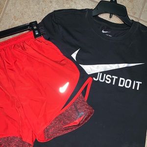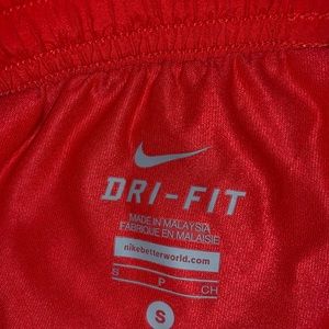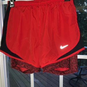 One pair of blood orange drifit Nike shorts with spandex shorts underneath