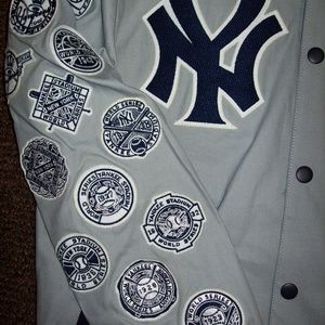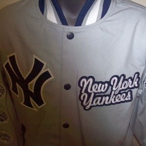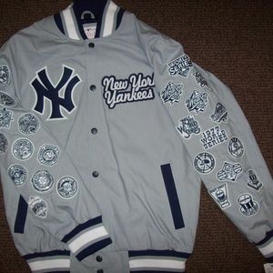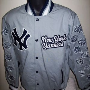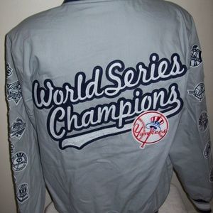 SIZE: MEN'S 3X. NEW YORK YANKEES 27 TIME MLB WORLD SERIES CHAMPIONS JACKET. Cotton jacket with sewn CHAMP patches of the World Series the Yankees won on the sleeves. Color GRAY with GRAY & OFF WHITE Trim. The jacket has 2 exterior pockets & 2 inside pockets. Inside lining is smooth soft polyester. This is a medium weight jacket. All the logos are meticulously sewn on. Jacket has nylon collar, cuffs & waistline. Measurements armpit to armpit 3X: 30" Top of Collar to Waist :33"