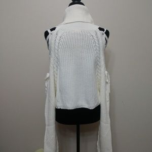 Adorable!! Comfy turtleneck ribbed sweater w/ cute tie up detail on shoulders and top of arm. Sweater has a wide waist and has more of a crop top style. Perfect paired with high waisted bottoms, leggings/layered with a tunic for modesty, or pair with low waisted denim to expose your midriff if that's your style. Sleeves attach to bottom of sweater to allow for the style and a billowy fit so sides do come up when you raise your arms. Off white color