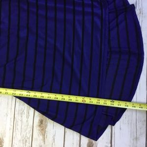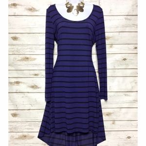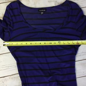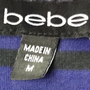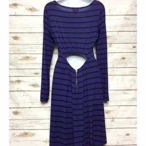 This sexy hi lo black & blue striped dress by Bebe has a cutout in back just above the zipper. The long sleeve dress is about 35 inches long in front and 40 inches in back. Made from 96% modal/viscose and 4% spandex for a bodycon fit. Size M, measures about 17 inches across from armpit to armpit and 13 inches at the waist. B2