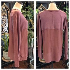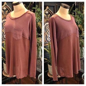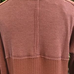 Love Riche rosewood thermal Waffle Knit Crew Neck top. Raw exposed seams. Size small displayed on dress stand. Color has a mauve base, with a hint of Taupe. Boho casual chic. Light weight.