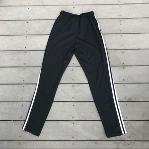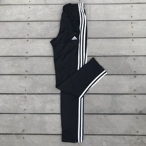 Description: black track pants with 3 stripe detail, pockets & zipper ankles