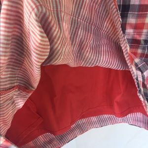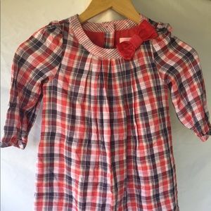 Plaid dress with bow detail on collar and pockets at sides. Flower button detail on back. Under lining and top dress. Never worn.