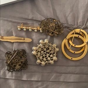 6 gold detailed beautiful broaches. The pearl clustered one is from The Limited and others are from various places. All in good condition.