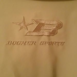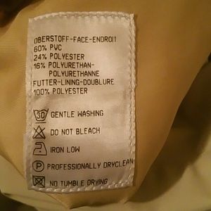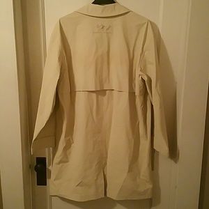 Cream colored Bogner raincoat, two side zipper pockets, back vent, length from shoulder 25", length from shoulder to hem 39", width across front bust 52". Made in Germany. Never worn. No size tag but approximately a ladies size 18